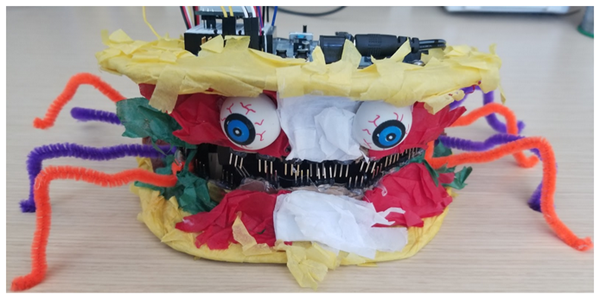 In my case I used as many 3-pin headers as I could fit in the mouth, and two eyes from a package of inexpensive spooky plastic eyeballs. I used pipe cleaners for the legs and I decided to shape them to resemble ones you might see on a spider.
