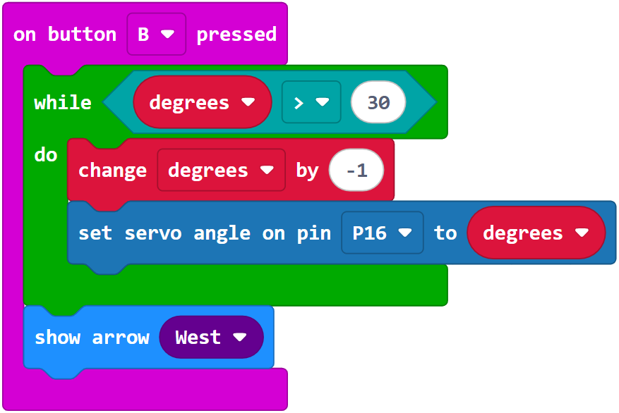 Instead of having to hold down the A or B button, a project can make the Gripper complete a close-lift or lower-open maneuver open and close on its own after a button press and release. Simply put the statements update the degrees variable and servo degree angle in a while loop that continues while the angle is greater than 30. A similar loop could also be written for button A that continues while degrees is less than 150.