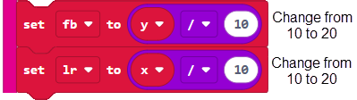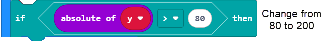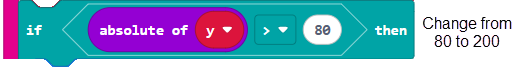 First, the range where there’s no motion and the micro:bit displays a diamond can be extended from 80 to 200. This will help prevent accidentally moving the cyber:bot when you press a button.