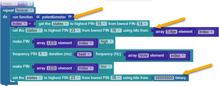 - Add a run function “potentiometer” block first thing inside the repeat forever loop.