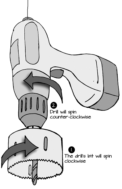 Do you remember that when an object is moving quickly it has a lot of momentum? The momentum from earlier in the chapter applied to objects moving in a straight line. What if an object is sitting still but rotating like a top? This is another kind of momentum called angular momentum. Just like momentum, the more quickly an object is rotating, the larger its angular momentum is. Momentum and angular momentum are both conserved. That means that if one part of an object starts rotating, another part of it must rotate in the opposite direction unless a force prevents it from rotating in that opposite direction. Imagine a drill hanging from a string. If the drill is activated, the bit will spin rapidly. The drill’s body will conserve angular momentum by rotating in the opposite direction: