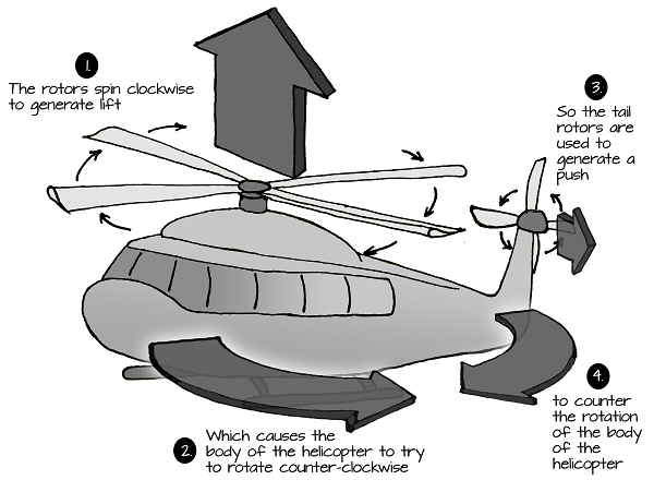 Helicopters experience this as well. By using a tail rotor, helicopters are able to prevent their bodies from spinning out of control:
