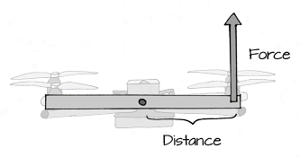 When a quadcopter tilts so that it can direct its thrust and move laterally, it does so by creating more thrust on one side of the quadcopter than the other. This difference in thrust creates a torque. A torque is a force applied some distance away from a rotating center: