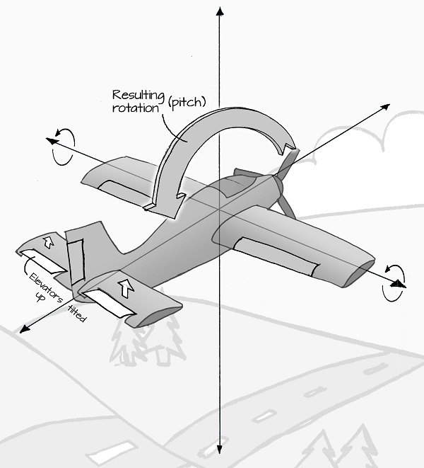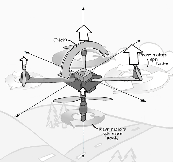 When a multirotor aircraft rolls, it begins moving sideways, which is a type of lateral movement. Lateral movement refers to any movement that is parallel to the ground. Another type of lateral movement is caused with a multirotor pitches. Pitch refers to the amount of forward and backward tilt. On an airplane, control surfaces called elevators are used to push up or pull down on the tail of the airplane, causing it to tilt up or down. Airplanes use this movement to climb or dive: