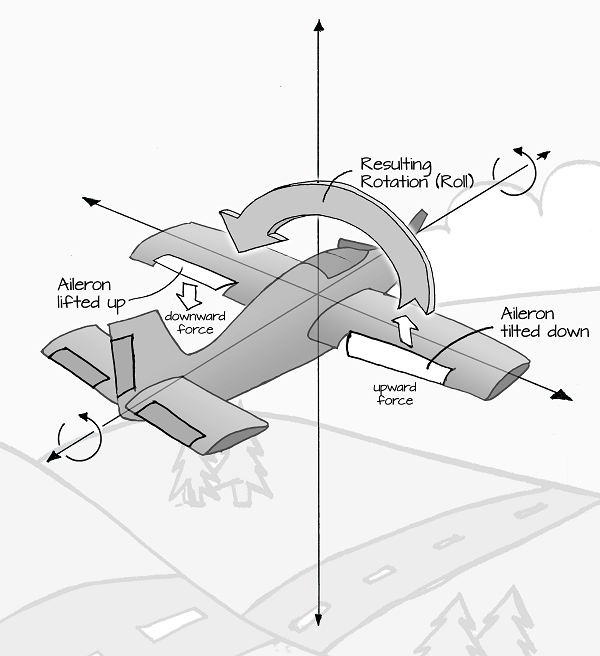 The set of flaps at the rear edge of the wings on an airplane are called ailerons. They are used to tilt the airplane sideways by causing one wing to push up and the other wing to push down. This motion is called roll. Rolling allows the airplane to turn: