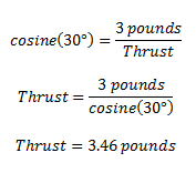 Next, we’ll use the cosine function to determine the length of the side representing the thrust. The cosine function describes the relationship between an angle and the ratio of the side adjacent to the angle and the hypotenuse (the longest side of a right triangle). When we do the math, we get: