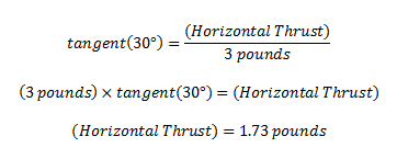 How much additional thrust is necessary? To answer that question, we’ll use some right-angle trigonometry. First, we have to know how much thrust is being put out by the quadcopter. If it is hovering, then the amount of thrust is equal to the weight of the quadcopter (remember: forces add up, and weight and thrust/lift cancel each other out if it’s not accelerating upward or downward.) For this example, we will say that the thrust is 3 pounds.