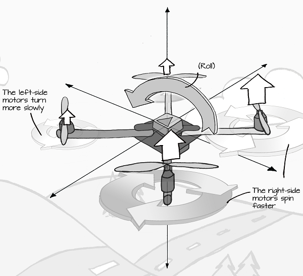 Multirotor aircraft like quadcopters don’t have control surfaces like airplanes so, but they are able to roll by speeding the motors up to generate more lift on one side and slowing down the motors to generate less lift on the other, causing a controlled tip that results in a roll: