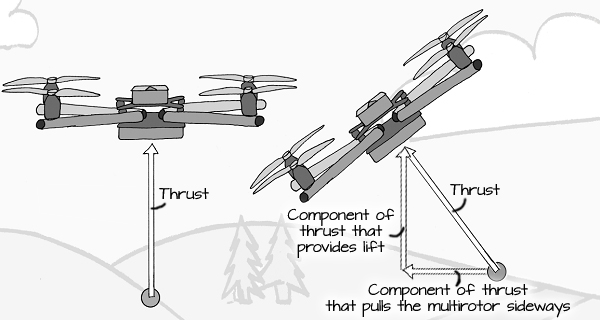 Notice that the part of the thrust that is lifting the multirotor is smaller? If the total amount of thrust is not increased, it will begin to fall because the thrust is no longer providing enough lift to counteract the pull of gravity: