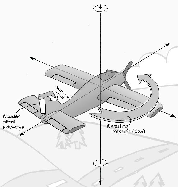 Airplanes are able to turn by using a control surface called a rudder. The rudder is used to push the tail to one side or the other, causing a rotation referred to as yaw. Yawing allows an aircraft to turn similar to how the front wheels of a car are used to make the car steer: