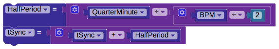 The tempo is calculated in the repeat-forever loop. The HalfPeriod equal to QuarterMinute divided by (BPM beats per minute, dividied by two). Next, the tSync variable is calculated. It is set to tSync (the current value of the system counter, stored before the loop) plus the HalfPeriod. Knowing the half period is convenient for turning sound on and off, along with the lights.
