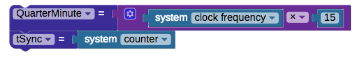 Two variables are created. The QuarterMinute variable is equal to the system clock frequency multiplied by 15 – which works out to be 15 seconds. The tSync variable is the current value of the system counter – some value between 0 and 4,294,967,295 which rolls over (the actual number doesn’t matter since we’re only interested in elapsed time). These variables are only assigned once.