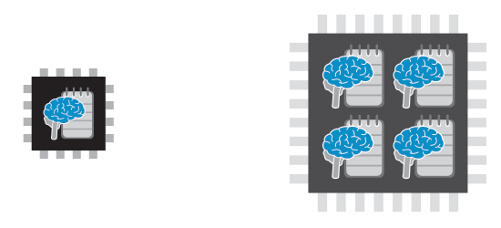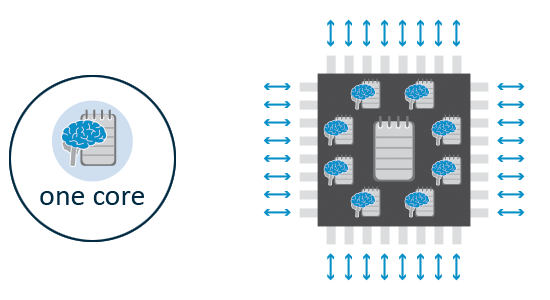 Imagine a chef in a kitchen with three assistants, making bread, roast beef, and sauce. The chef puts one assistant at the stove to stir the sauce every minute. Another assistant is sent to keep watch on the thermometer, and remove the roast when it reaches 120 °F. Now the chef is free to knead bread dough for 15 minutes. The three cooks (processors) are keeping all three processes (kneading, stirring, roasting) executing at the same time, without any task-switching interruptions, and without missing the moment when the thermometer reaches 120 °F. There is even an extra assistant ready to help if something more is needed.