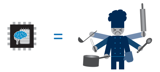Imagine a chef in a kitchen alone, making bread, roast beef, and sauce. The chef must knead the bread dough for 15 minutes, interrupt that task every minute to stir the sauce, and remove the roast from the oven as soon as a thermometer reaches 120 °F. At any moment, the chef (processor) is executing only one task, while keeping all three processes (kneading, stirring, roasting) going at once.